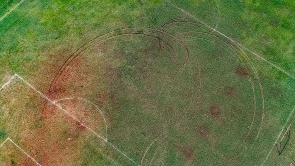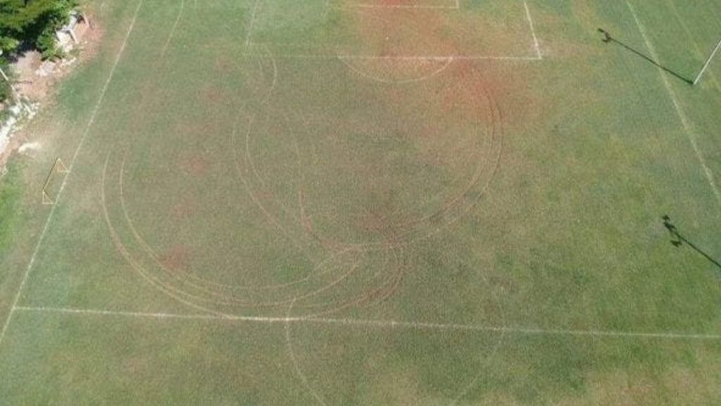Algo que causa extrañeza es que las marcas en el campo de futbol son más profundas que las que podría haber hecho una cortadora de césped y su trazo puede indicar a que se realizaron al mismo tiempo o de manera consecuente, como si se tratara de un trazo.