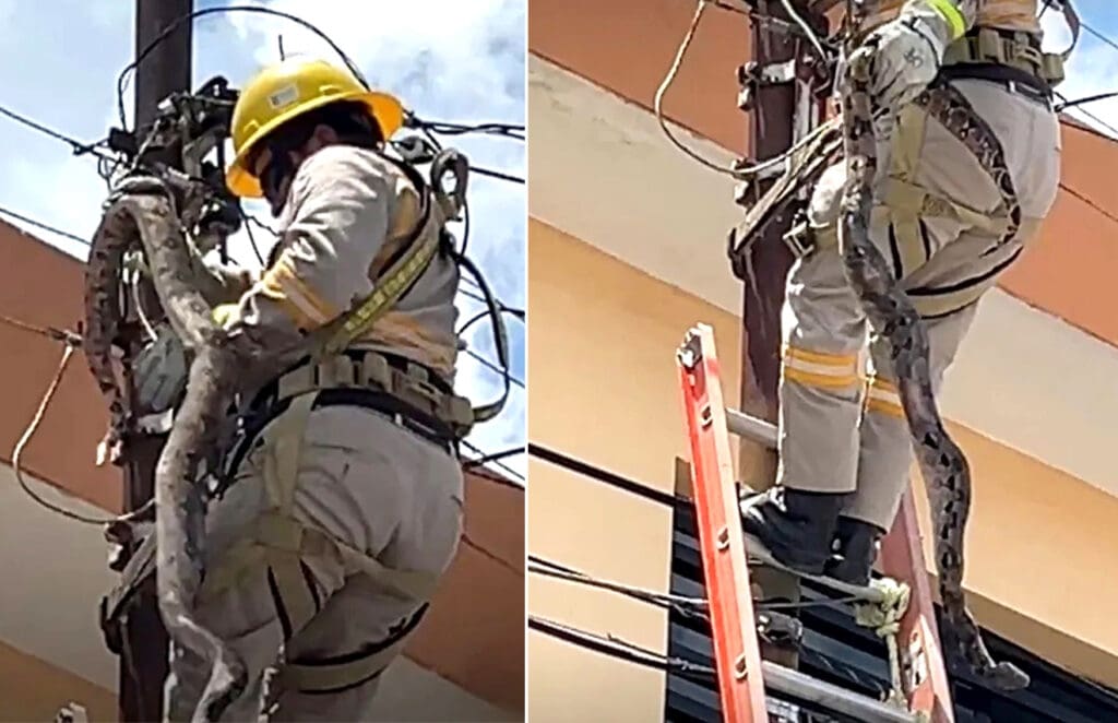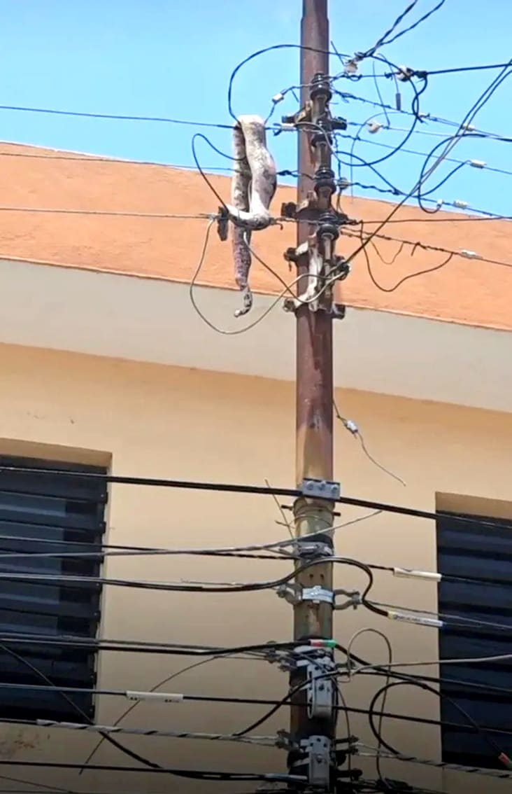 Testigos informaron que la serpiente, al ser hostigada por varias aves, intentó descender por un poste de luz al intentar escapar, pero al entrar en contacto con los cables de alta tensión sufrió una descarga mortal y quedó colgada.