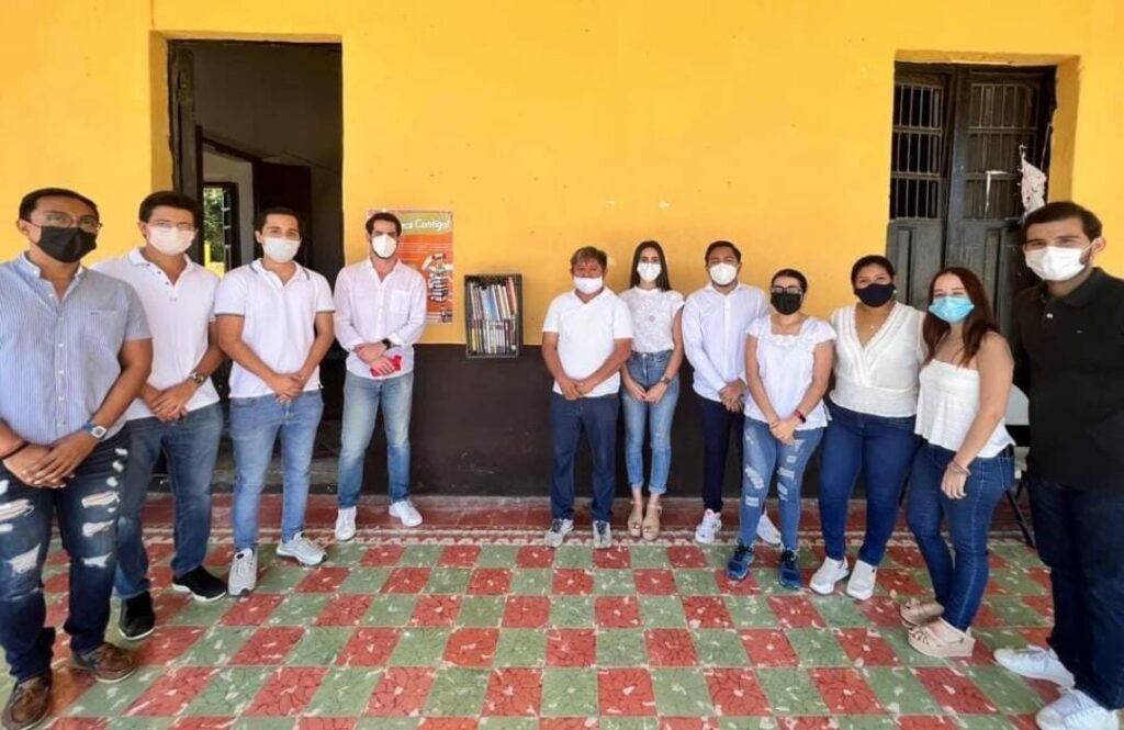 Se trata de integrantes de la Red Mundial de Jóvenes Políticos de Yucatán, quienes decidieron organizarse para inaugurar lo que fue llamado una “biblioteca comunitaria” en la localidad de Dzityá. Aunque como podemos ver, se trata de un cajón o huacal, como también se le conoce, con libros.