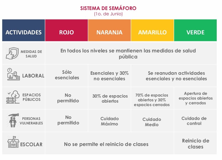 El 1 de junio, como se indicó, se inaugurarán los semáforos estatales, que constarán de cuatro colores (rojo=máximo, naranja=alto, amarillo=intermedio y verde=cotidiano) y serán administrados por la Secretaría de Salud federal.