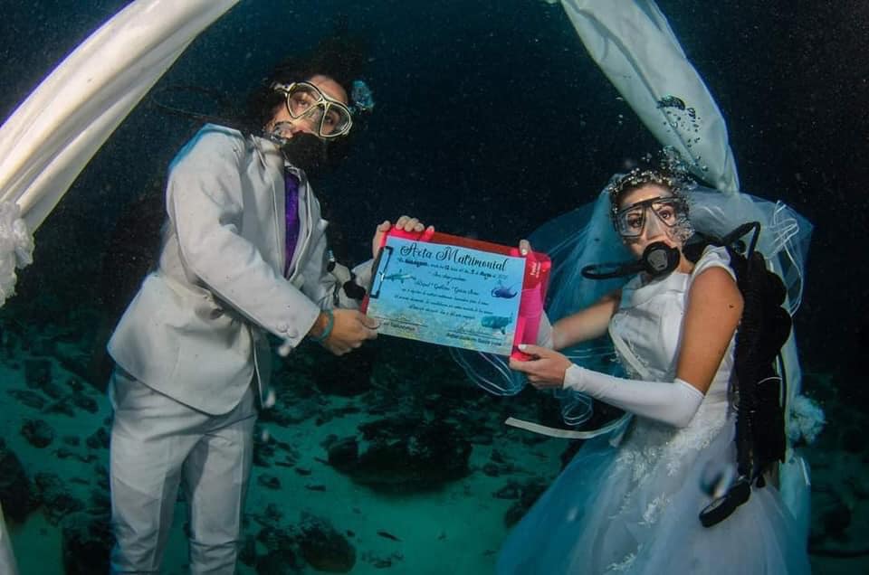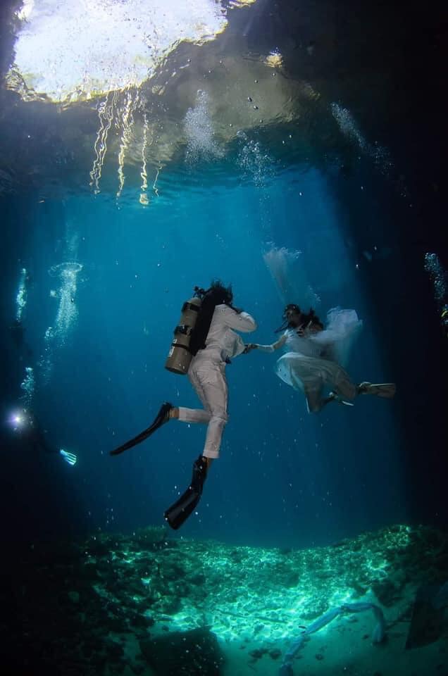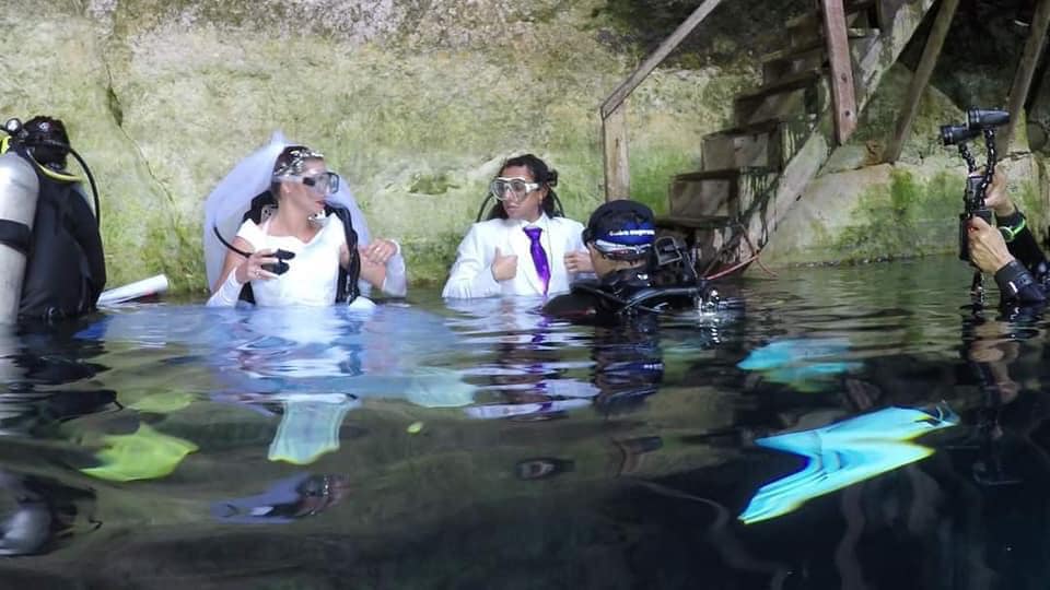 Tecoh, Yucatán.- Si bien hay quien prefiere casarse ante un juez en un Registro Civil y/o en la iglesia como sus padres y abuelos, existen otras parejas que buscan más acción y misticismo como el de una boda subacuática en un cenote, tal y como hicieron estos novios que se dieron el “sí” bajo el agua.