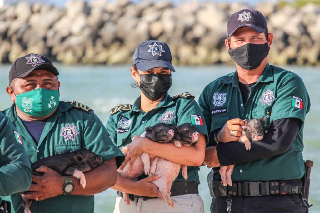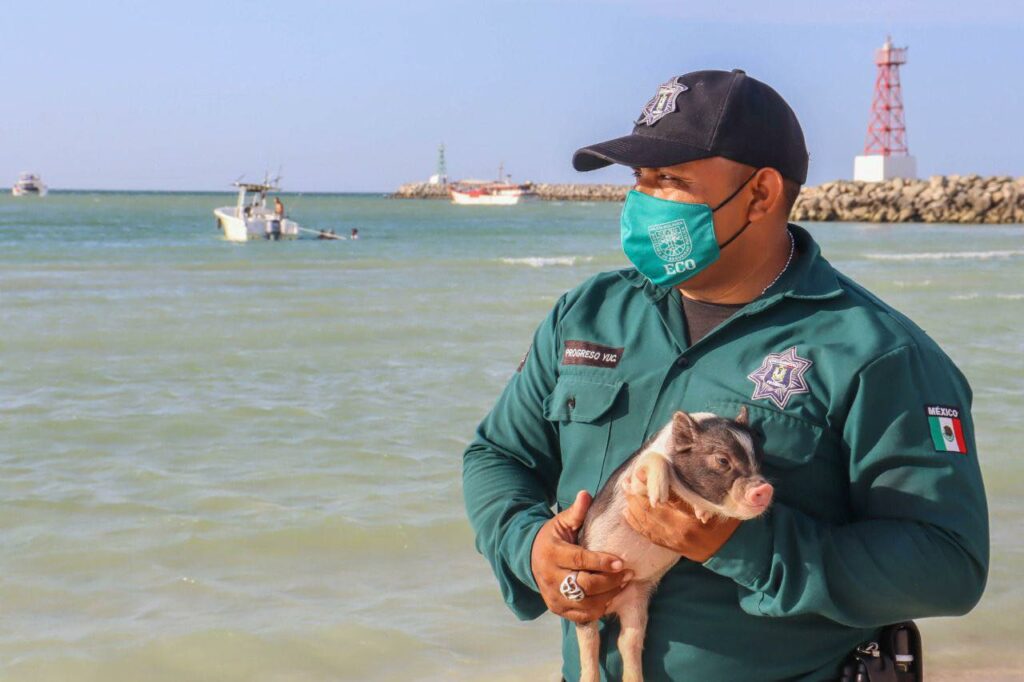 Progreso, Yucatán.-Una camada de cerditos abandonada fue rescatada por la Policía Ecológica de Progreso, que les permite nadar un rato en la playa y por eso han robado los corazones de los cibernautas.