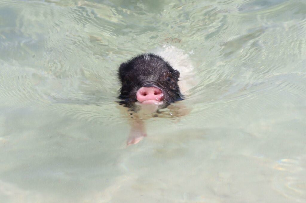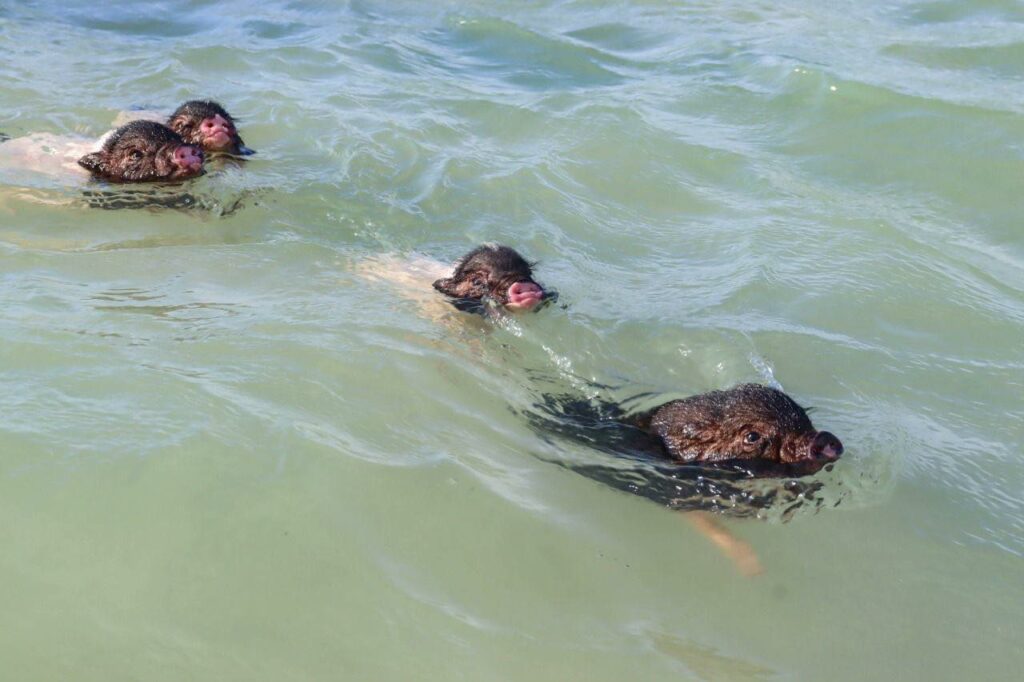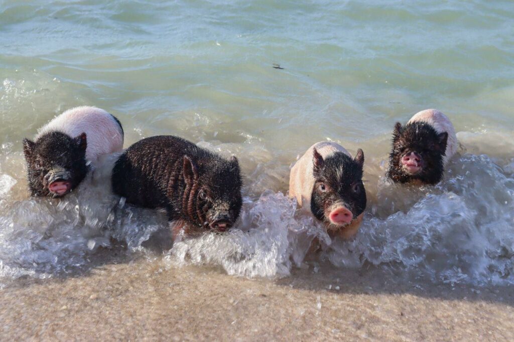 La camada de puerquitos disfruta del mar, buena comida y salud plena.