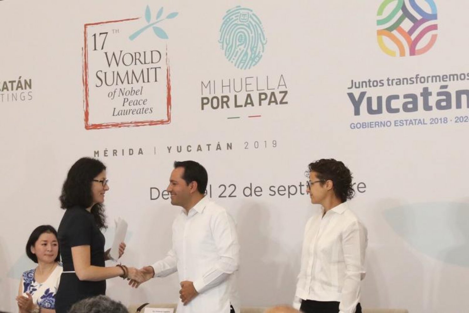 “Yucatán será llevado a todos los rincones del planeta con un solo objetivo: transmitir un mensaje de paz. Y la paz empieza en nosotros mismos desde nuestros comportamientos y ese conjunto de pequeñas acciones es lo que puede construir una paz a nivel global”, agregó ante la integrante del Consejo de la Cumbre Mundial de Premios Nobel de la Paz, Gensei Ito; y de Viktoria Devdariani, enlace con Jóvenes del mismo.