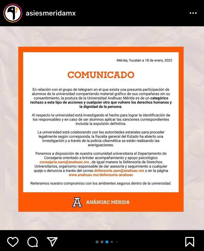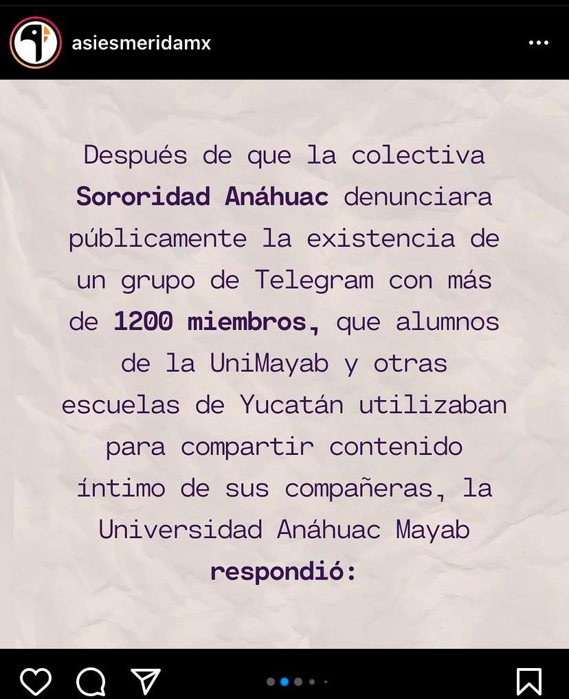 “¡Denuncia! Es inaceptable que en una escuela con tanto prestigio se pueda tolerar este tipo de comportamientos y actitudes, como mujer estoy destinada a solo ser un producto de consumos?, Como mujer nací solo para ser cosificada? Este es el tipo de gente que hay en tu escuela @anahuacmayab, 1280 abusadores sexuales, que comparten fotos y videos de sus novias, de sus amigas, de sus ex, de personas! Esto tiene que acabar”, escribió el colectivo.
